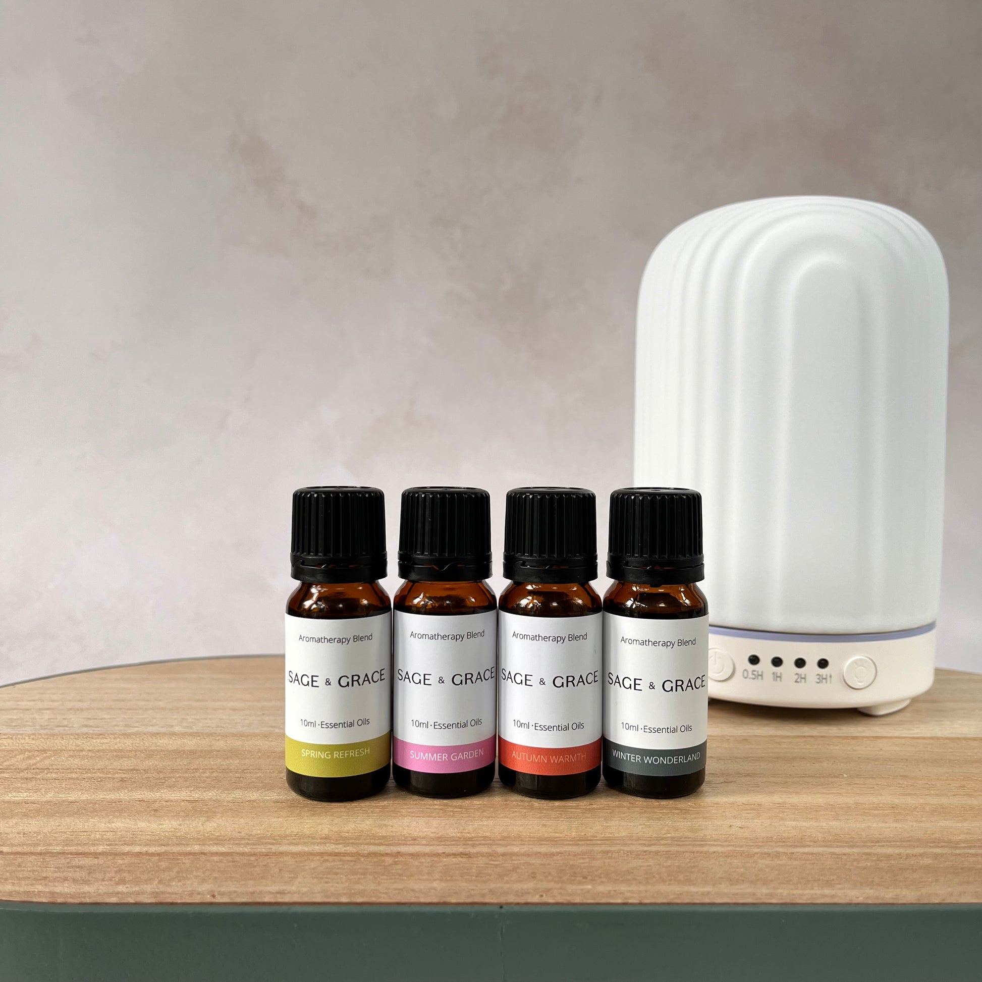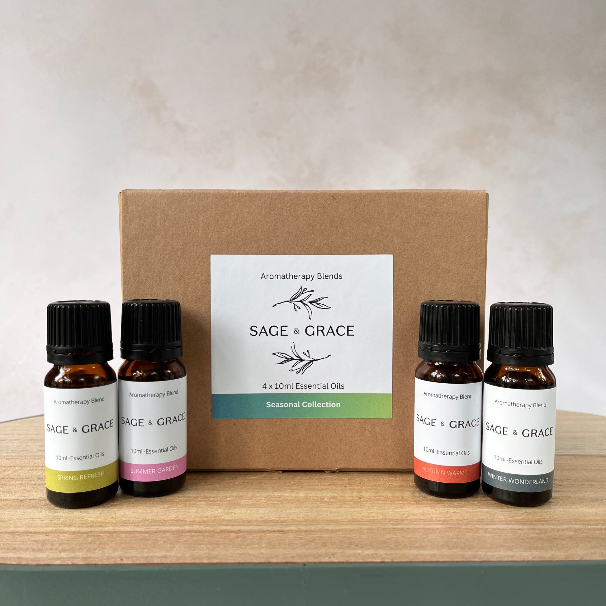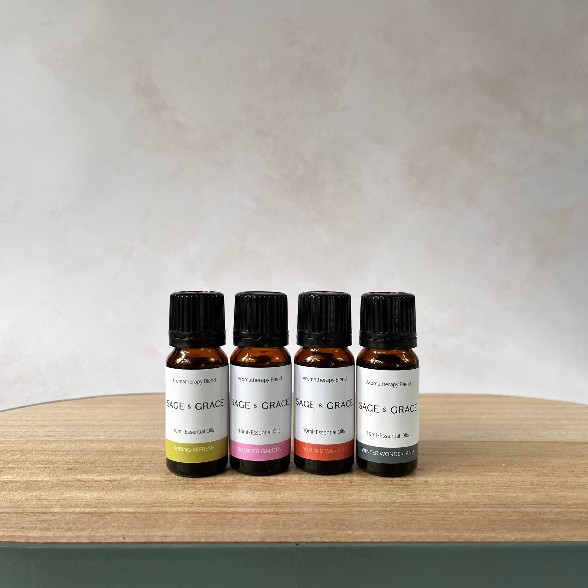 This oil collection set contains 4 essential oil blends from the 4 seasons;
